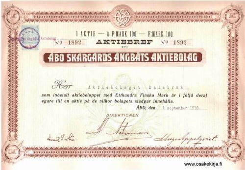 | -osakekirja vuodelta 1918, © www.porssitieto.fi |