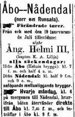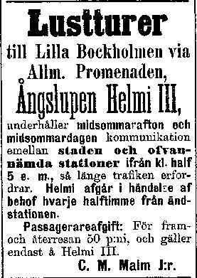 | -rakennettu 1883 Turku, - tilaaja Ånslupsbolaget Helmi, - nimeksi Helmi III, - rautarunkoinen höyrysluuppi | ||