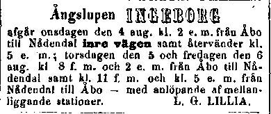 | -rakennettu alunperin myytäväksi, mutta kauppaa odotellessa ajoi elokuuhun 1875 Turun paikallisliikenteessä Turku - Ruissalo ja Turku - Naantali sisäkautta liikenteessä Åbo Ångbåts Ab toimesta. | ||