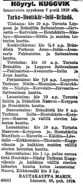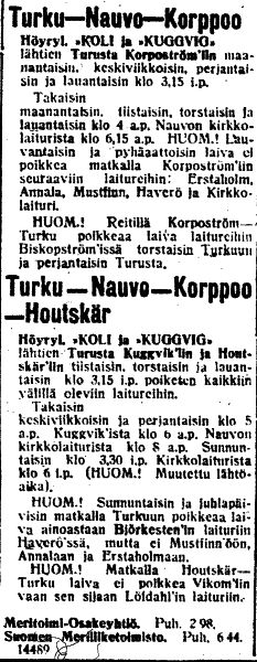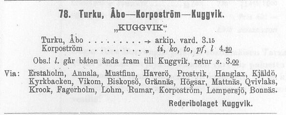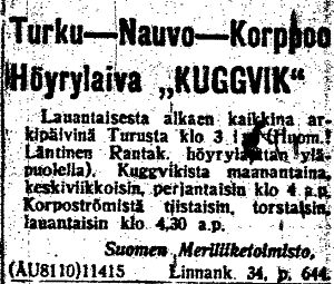 linjaa Turku - Nauvo- Kuggvik (Korppoo) aina vuoteen 1930