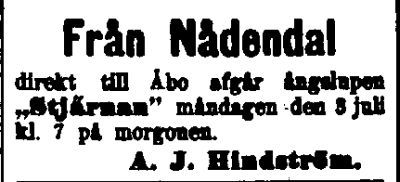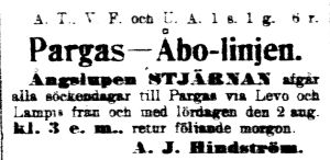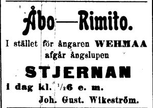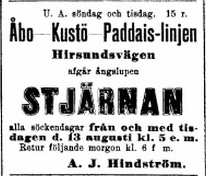 | -11.06.1899 ÅU, herra A.Hindströmin omistama höyryvene Stjärnan ajoi kivelle Korppoossa. Oliko sama laiva? | ||
